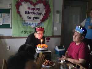 이어서 새로 오신 조리사 선생님을 소개하고 인사를 나눈 후 본격적인 생일파티를 열었습니다. 이번 달 생일의 주인공은 X환 씨와 X진 씨였으며, 함께 초를 끄고 축하의 노래를 부르며 따뜻한 시간을 보냈습니다. 또 유X도 아저씨가 이번 달 생일이셔서 깜짝 축하노래를 불러드렸는데, 얼굴이 붉어지며 쑥스러워하시는 모습이 무척 귀엽고 정겨웠습니다. 모두가 그 어느 때보다 큰 목소리로 축하 노래를 불러드려 분위기가 한층 더 화기애애했습니다.